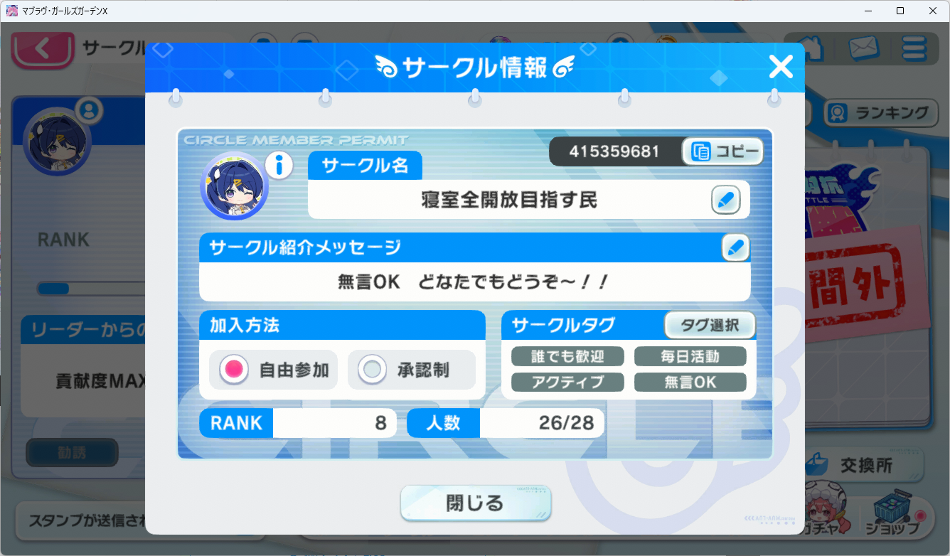 【方針】サークル戦10%%維持目標 基本無言部屋(サークル戦時や情報共有等リーダー含め稀に会話してます)